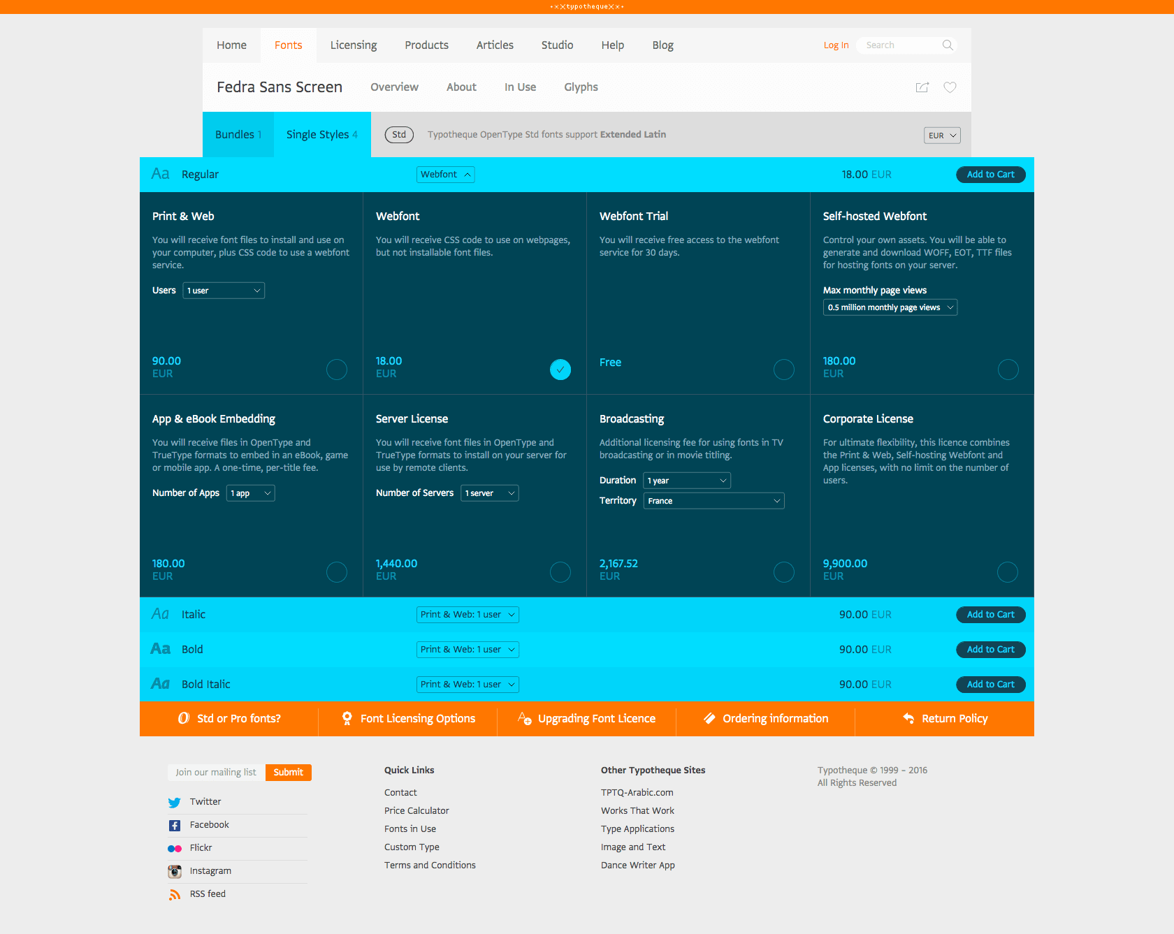 dtl webfonts are licensed against lump sum prices, irrespective the number of site visitors and for an unlimited period. The price per weight/style of a single byte svgz, Cufón or sifr font is €500. The eot, woff, ttf and svg fonts are sold as @font-face bundle and such a bundle costs €1250 per weight/style (single byte).
